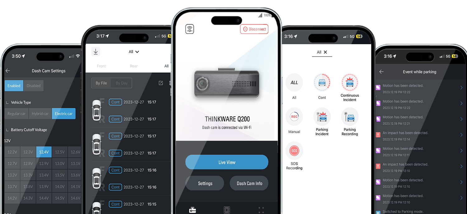 THINKWARE DASH CAM LINK uygulamasıyla araç kameranızı uyumlu herhangi bir Android veya iOS cihazıyla zahmetsizce eşleştirin. Bağlandıktan sonra, ayarları kolayca değiştirebilir, görüntüleri tekrar oynatabilir ve en son sürüş videolarınızı hareket halindeyken indirebilirsiniz.
