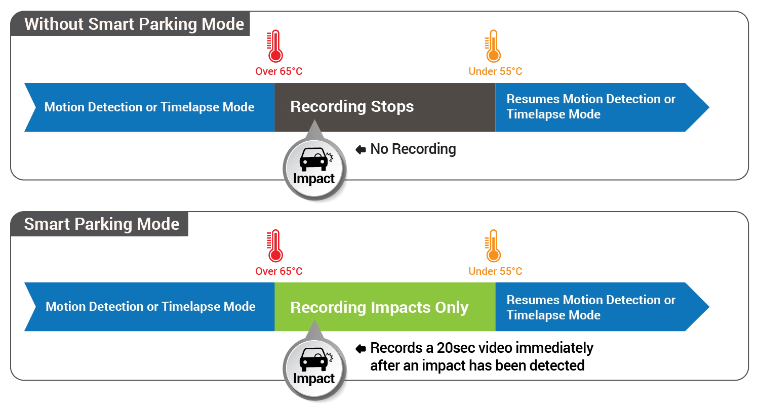 Sadece darbe algılandığında kayıt yaparak güç tasarrufu sağlar ve araç kamerasının uzun süreler boyunca Park modunda kalmasını sağlar.